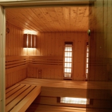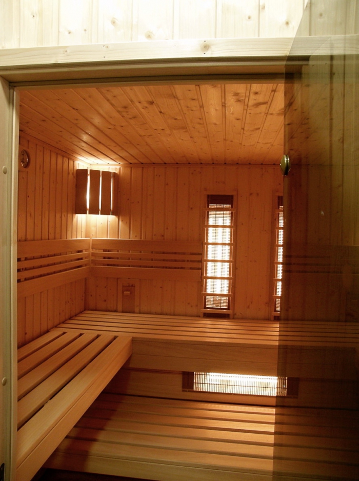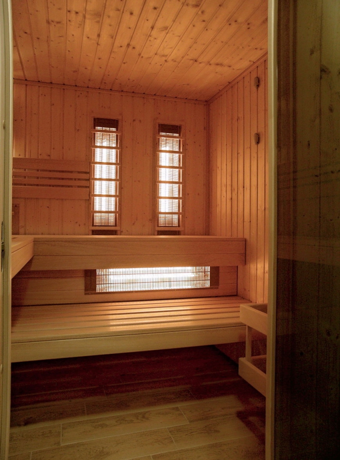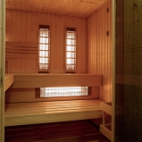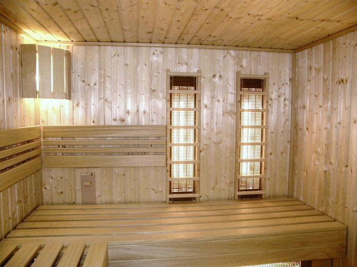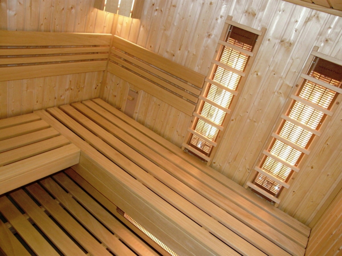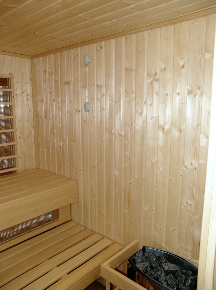 Obklad sauny je z fínskeho smreku, lavice z africkej vŕby - Abachi.