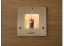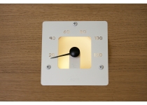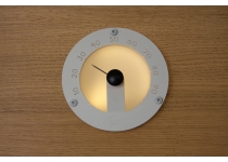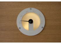 Kombinovaný teplomer a vlhkomer do sauny. Je vyrobený, aby odolal vysokým teplotám, zo satinovaného skla a nerezovej ocele. Možno ho krásne osvetliť dvoma sklenenými vláknami s priemerom 2-4 mm. Dizajn: Frida Lindström.