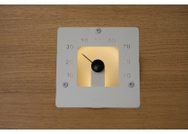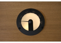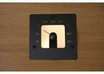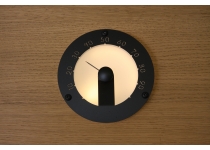 Kombinovaný teplomer a vlhkomer do sauny. Je vyrobený, aby odolal vysokým teplotám, zo satinovaného skla a nerezovej ocele, čierne prevedení. Možno ho krásne osvetliť dvoma sklenenými vláknami s priemerom 2-4 mm. Dizajn: Frida Lindström.