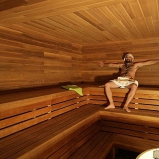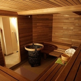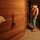 Výbornou voľbou sa ukázalo použitie krátkych cca 50cm orezaných paluboviek cédru ako vnútorný obklad. Striedajúce sa farby paluboviek dávajú saune rustikálny feeling (mimochodom veľká rôznorodosť a "priznanosť" nadväzujúcich spojov je veľkým hitom u amerických sáun). Je to dôkaz, že keď je fantázia, dá sa využiť akákoľvek dĺžka dreva, len musí byť vhodná k stavbe sauny