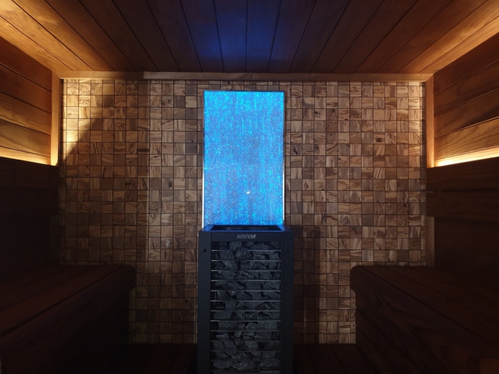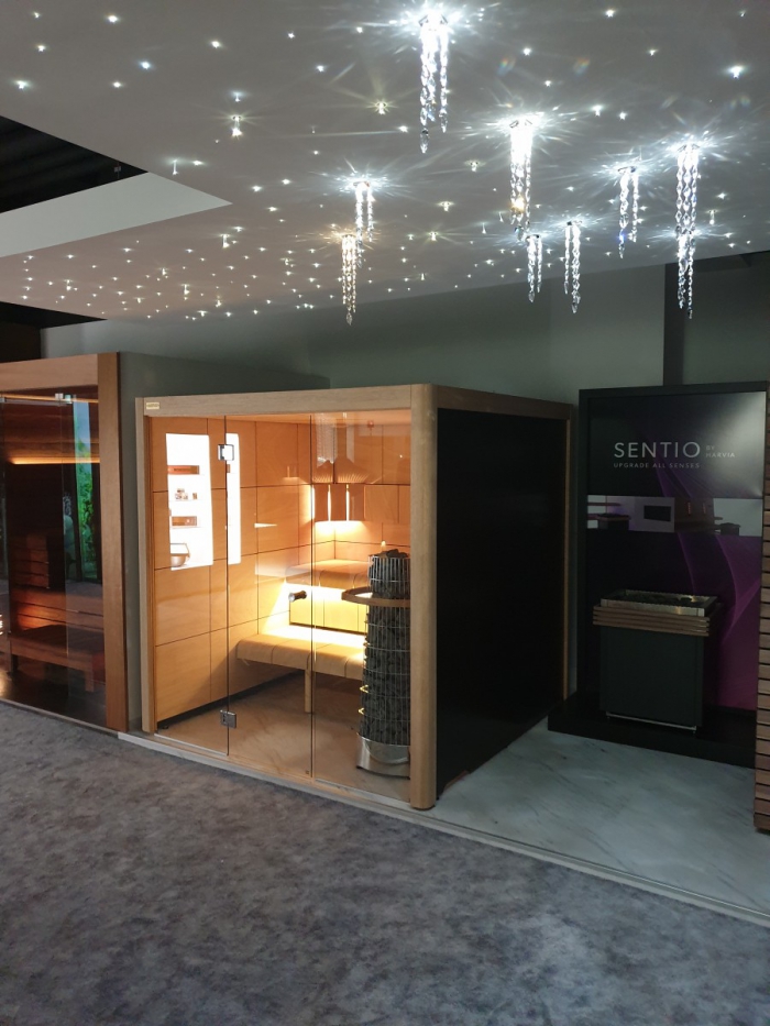 Súčasťou expozície je 11 typov sáun, napr. dizajnová sauna Harvia Claro, parná kabína či biosauna, saunové pece a doplnky Harvia a Sentio, osvetlenie Cariitti a mnoho ďalšieho.
