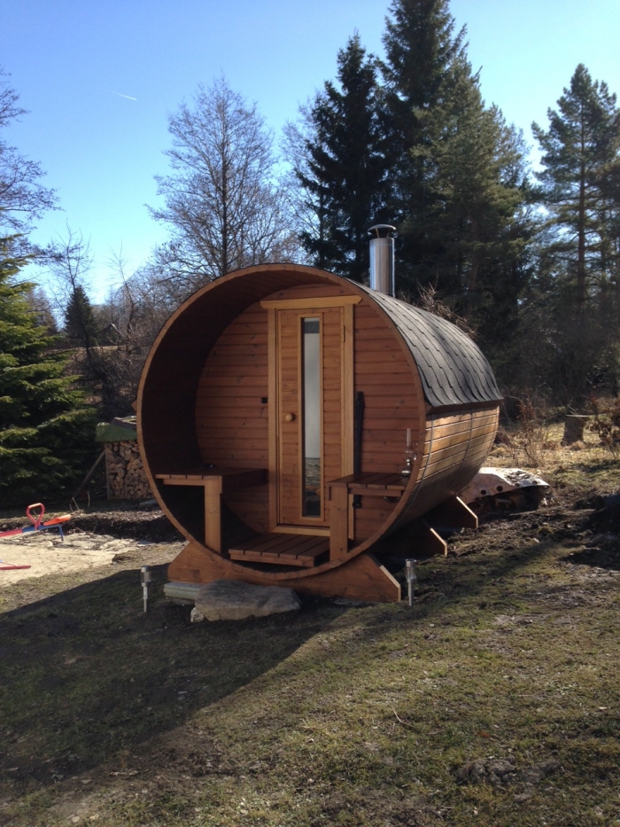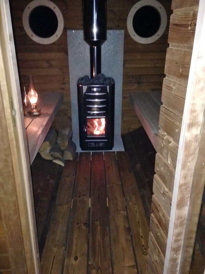 Sauna je vyrobená z termoborovice, potné miestnosť je ideálna na ležanie dvoch osôb či sedenie pre 4, sauna je zozadu osadená guľatými okienkami, predná časť je doplnená odpočívacou verandou. Kachle Harvia M3 sa postarajú o vyhriatie sauny za 40 minút, sklenený priehľad v kachliach sa postará o atmosféru. Do sauny nie je privedené svetlo, to zabezpečuje okrem priehľadu v kachliach petrolejka, aby sa sauna čo najviac blížila formáte tradičné fínske sauny.