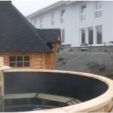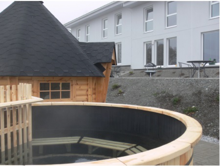 Súčasťou dodávky bol aj drevený kúpací sud Hot túb, ktorý sa s kotov skvele dopĺňa.